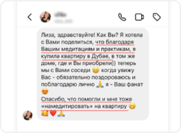 I honestly don't know where I got MONEY ON MY CARD from twice with a two-week interval, I'm on vacation and wasn't expecting any payments))) Usually, you can tell when it's from work. But these transfers were from an UNKNOWN source. It's so nice! I'm just thrilled! I'll keep up with the meditations. Thank you, Lisa.”